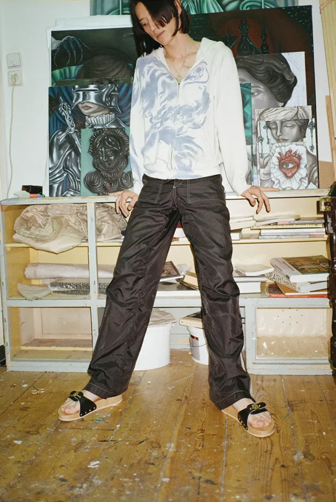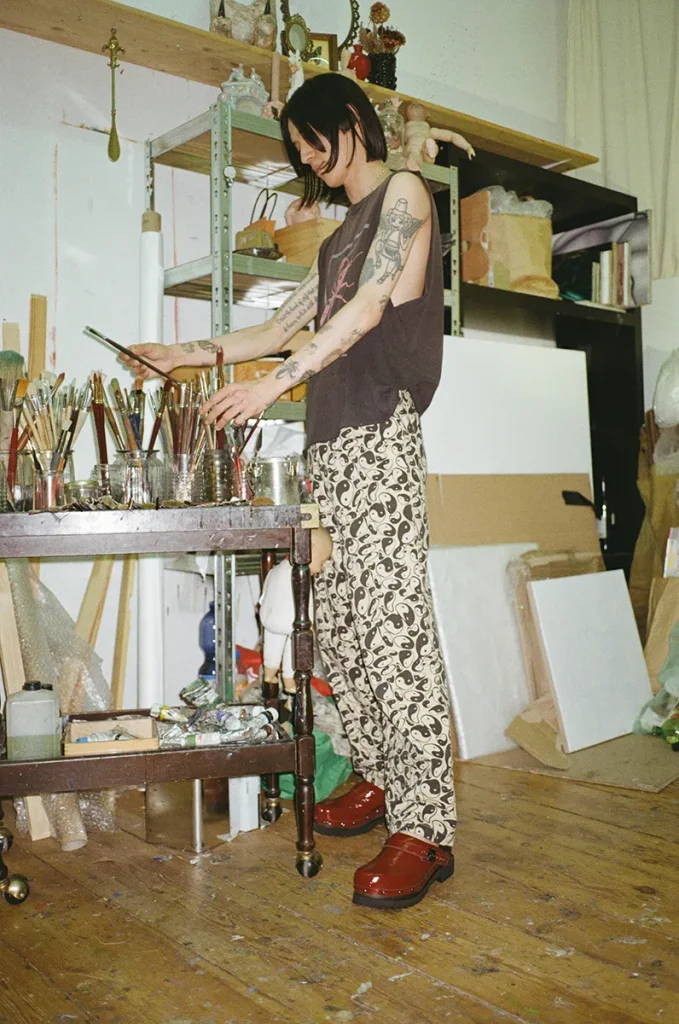 Self-taught Japanese painter Ryo Koike navigates worlds of paints and pigment. Grounded by the aesthetic comfort of Scholl shoes, his hands are guided by instinct, precision, and the quiet ritual of craft