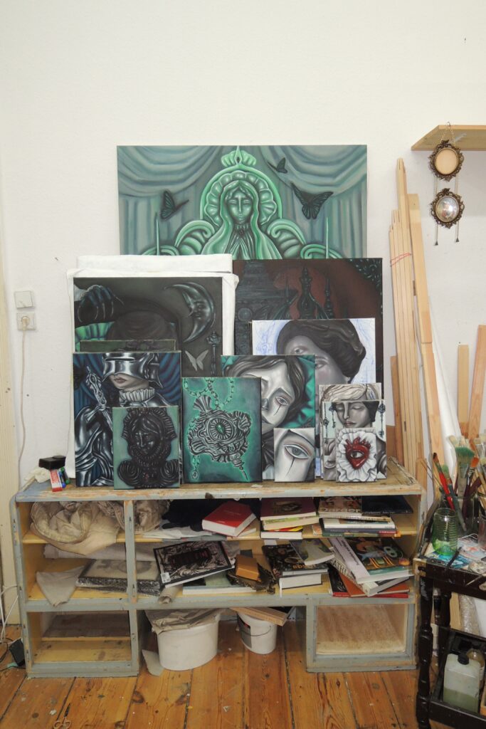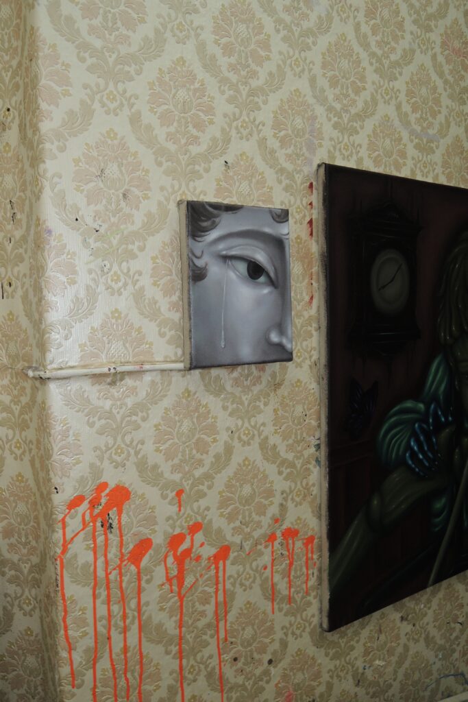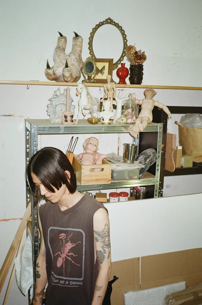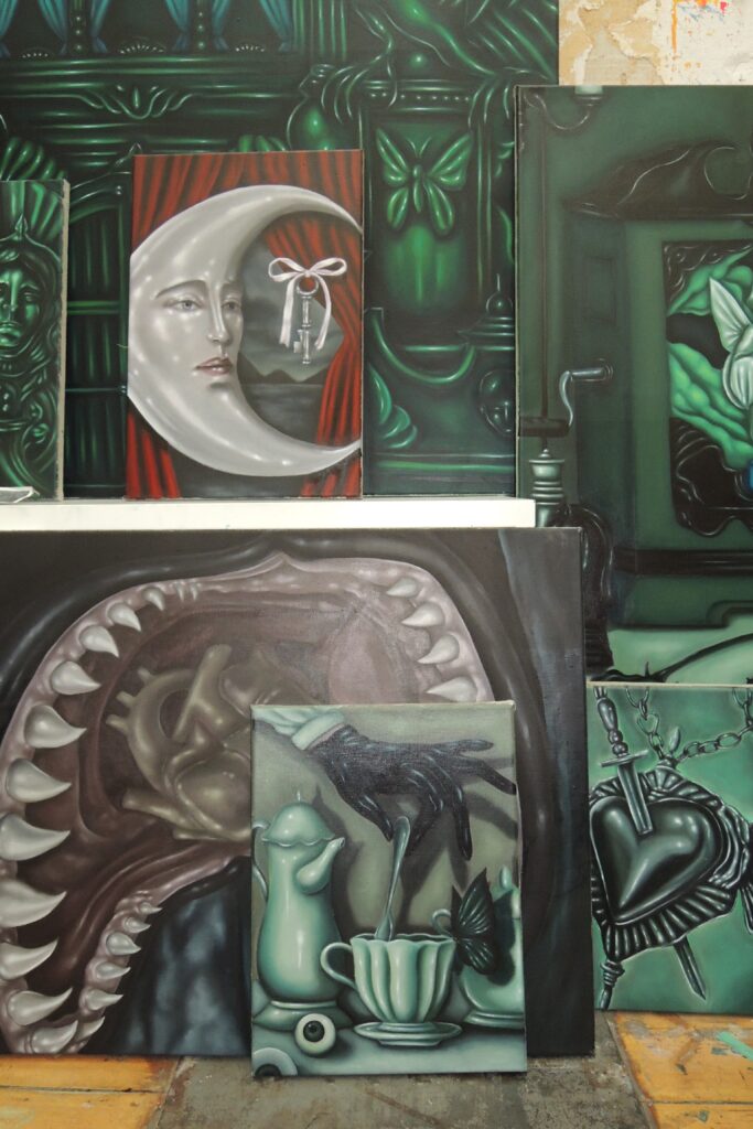 Against the paint-splattered white walls and faded tan wallpaper of his studio, Koike’s palette of deep greens, chrome greys, and piercing reds glows with its own, otherworldly aura. Paintings are everywhere—leaning against each other on shelves, hung on walls, standing on the floor. Found objects cluster on wooden shelves like offerings: a marbled, claw-like sculpture, a marionette, dried flowers, doll parts, a baroque-style mirror, a framed butterfly. That day, the sun was out, but the curtains were drawn.